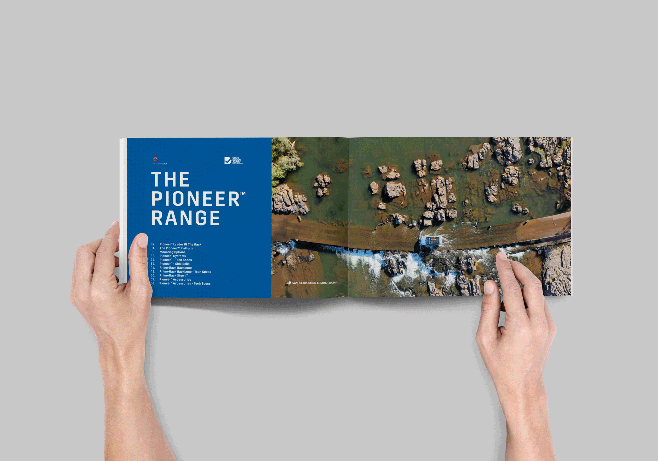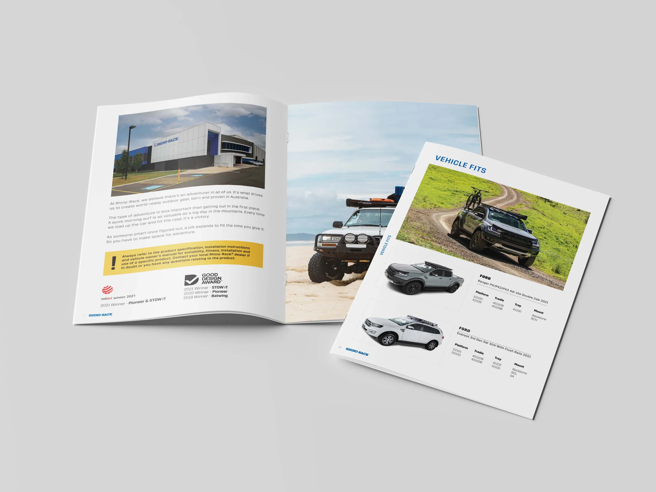 Each year Rhino Rack releases a catalogue to showcase its vast selection of products and accessories – all tailored to different models of vehicles and years. The information can be overwhelming customer, especially working out what to look for their vehicle. The catalogue was designed to make the process easier; with visual diagrams, in location imagery and large typography to call out different product functions.